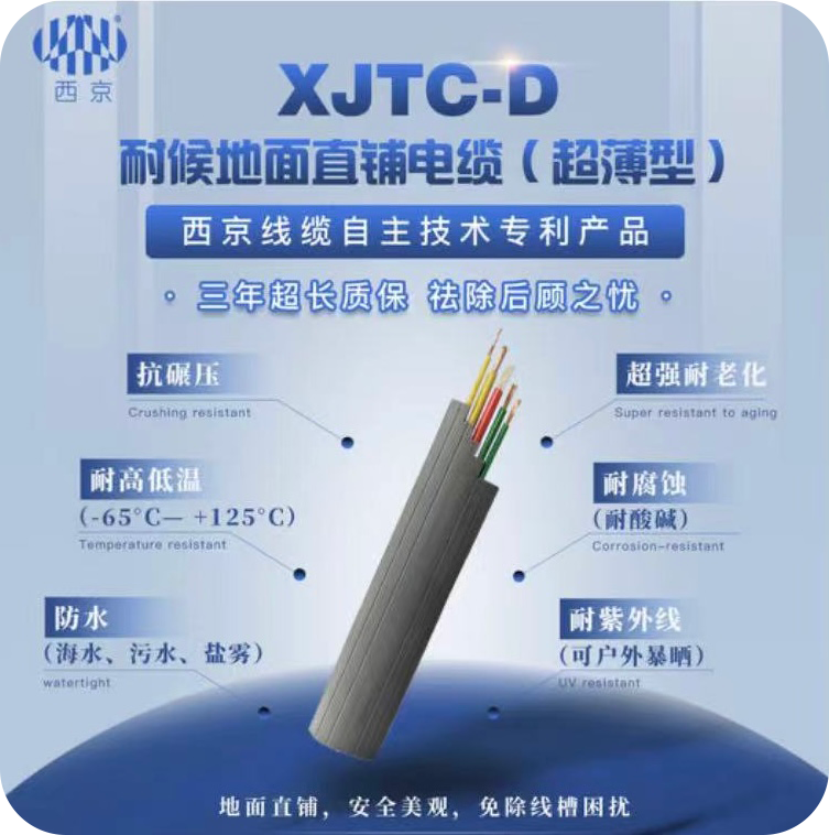 XJTC-D系列产品可以适应各种极端自然环境(如极寒、高温环境、长期日晒,涉水、海洋环境、酸碱下长期裸露等),同时也能够长期经受高强度车辆碾压,拖拽、摩擦等人为老化因素,使用寿命极长。具有柔软、高回弹、强抗压等性能。我司研发部门经多轮实验确定的“扁弧形平行电缆”结构,能够有效的达到减压、抗造、防滑减震、耐形变的效果。